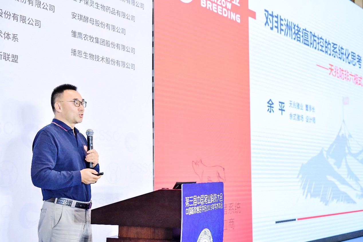 天兆豬業(yè)作為此次大會的發(fā)起人單位,對大會予以了全力支持。天兆豬業(yè)董事長余平在會上作了《對非洲豬瘟防控的系統(tǒng)化思考——天兆防非六模式》的主題報告,分享了在這場令養(yǎng)豬人談“非”色變的重大疫情中,作為養(yǎng)豬業(yè)的上游,種豬企業(yè)如何做好生物安全防控。