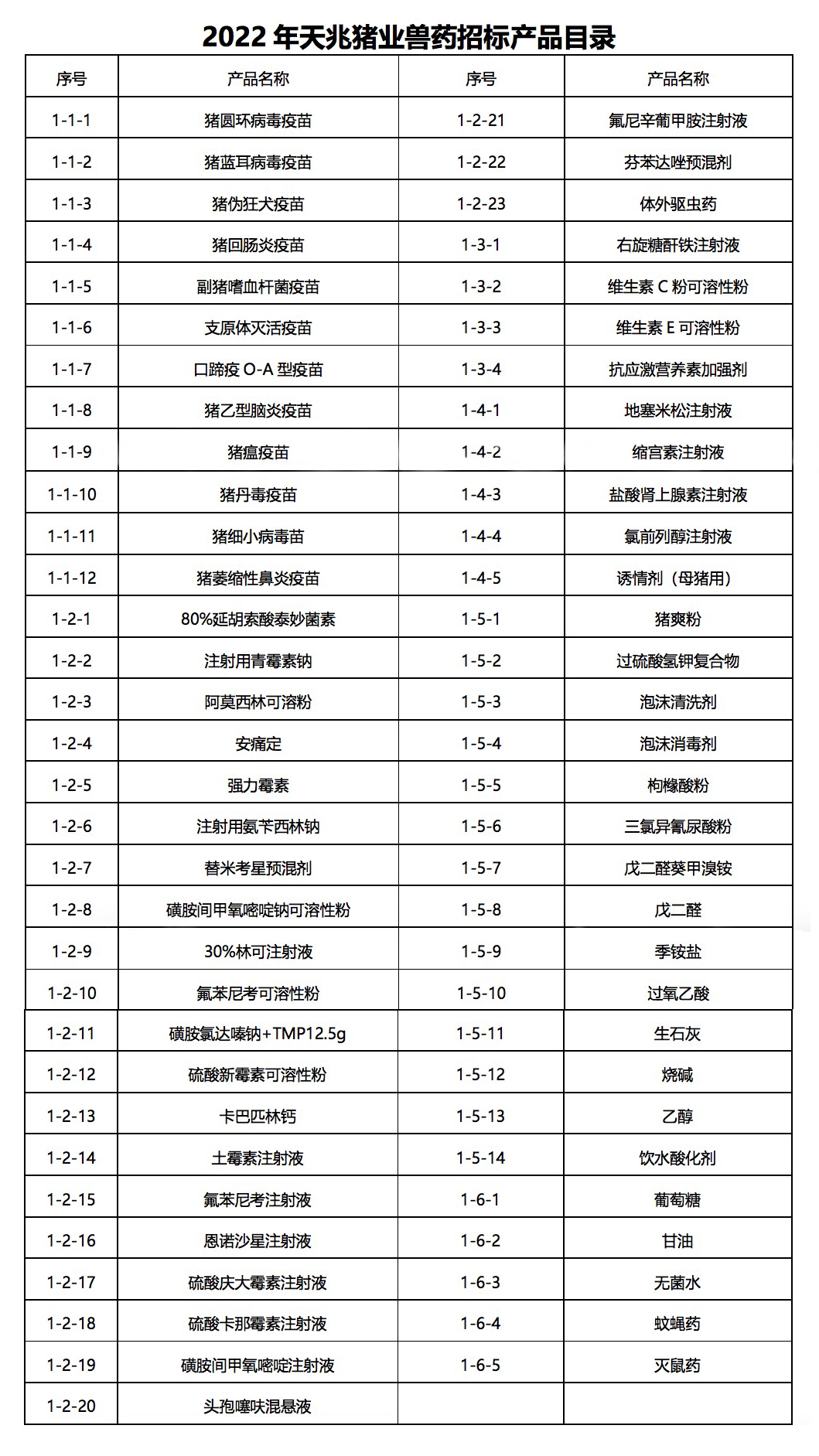 豬用疫苗、抗生素、消毒藥等豬場(chǎng)生產(chǎn)相關(guān)藥品。招標(biāo)產(chǎn)品參見附件《2022年天兆豬業(yè)獸藥招標(biāo)產(chǎn)品目錄》,但不僅限于附表。